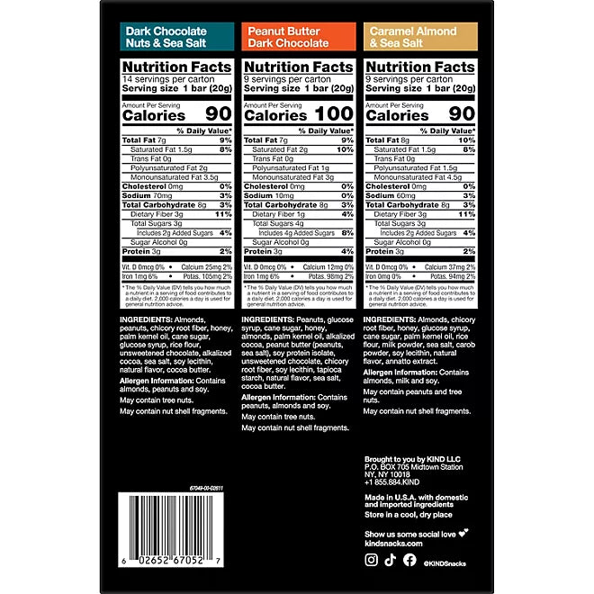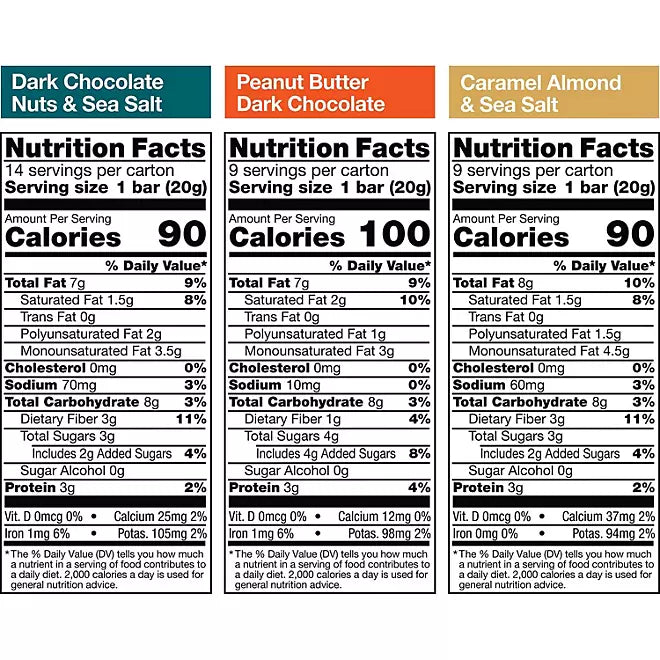 Includes 32 mini bars; 14 Dark Chocolate Nuts & Sea Salt bars, 9 Peanut Butter Dark Chocolate bars, 9 Caramel Almond & Sea Salt bars